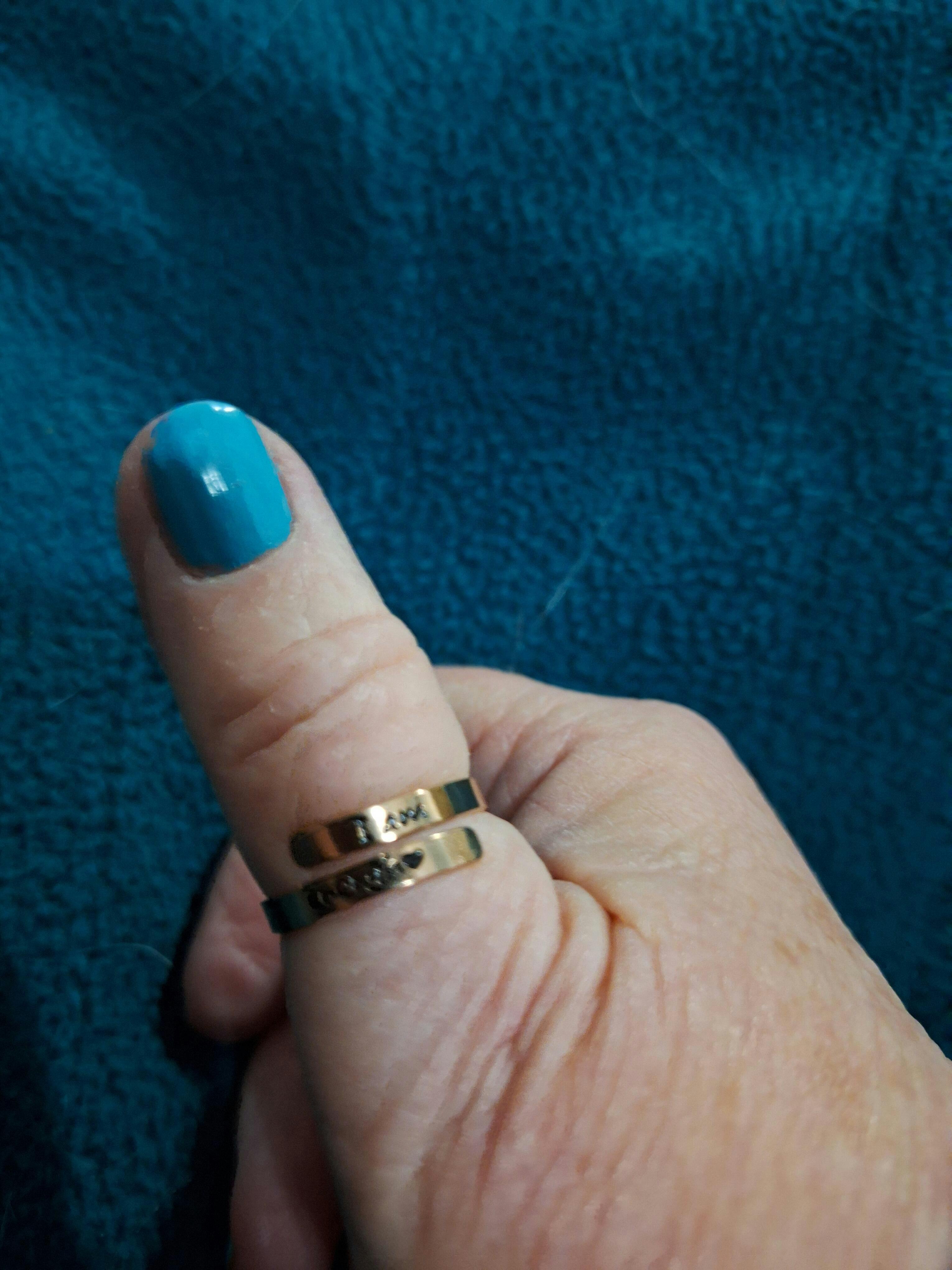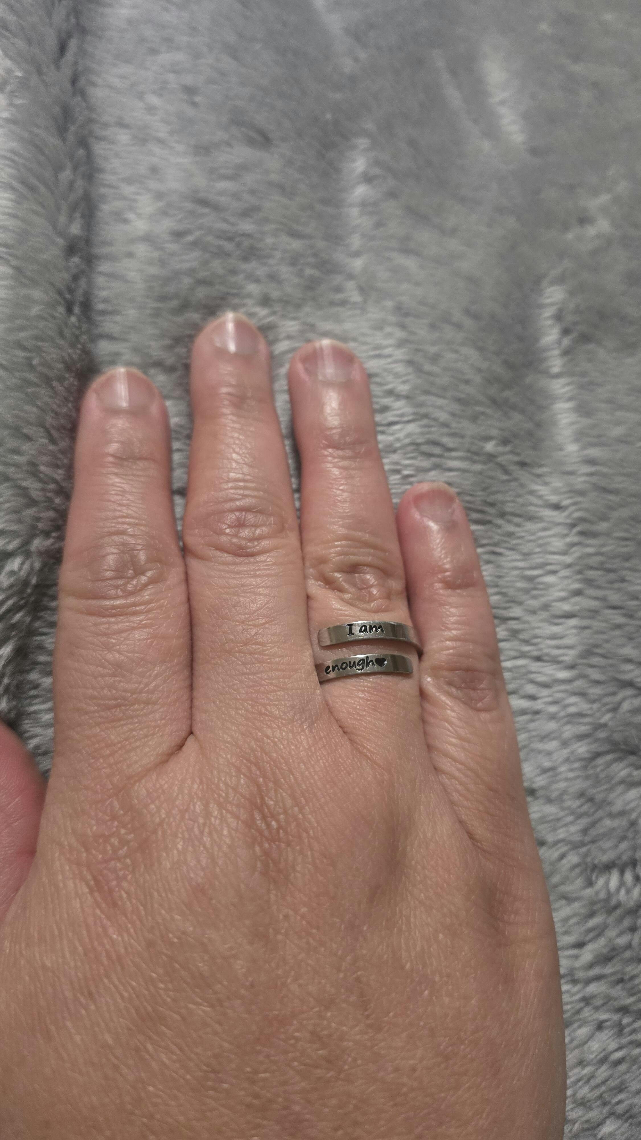 "First off this ring is very important to me because I deal with pretty intense mental health issues and this is a reminder that I am enough regardless of my extras. It is a constant reminder and brings a wave of calm and recentering. As for the actual ring, it is very comfortable. Some adjustable rings, when you open them to fit they stretch oblong and this ring stays in shape so no part of my finger is squished. It is also smooth so it does not irritate my finger at all. I believe it will be a ring that i wear for years. ❤️" - Pam H. ⭐️⭐️⭐️⭐️⭐️